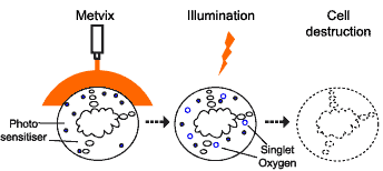 Estas, al ser iluminadas por una radiación de luz específica, producen, en su interior, una reacción intracelular transformando al oxigeno estable en inestable con liberación violenta de radicales libres que provocan la muerte por implosión selectivamente y sin afectar a las células normales.