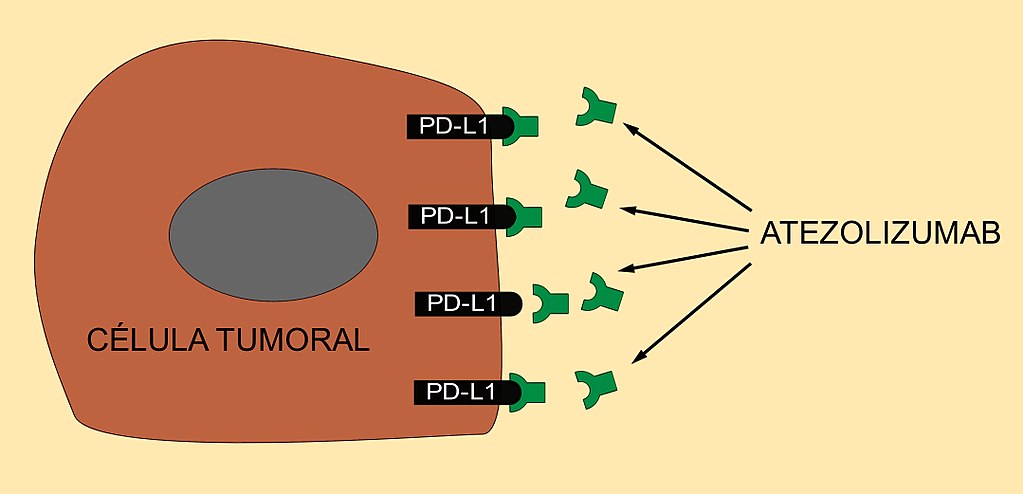 Atezolizumab es un anticuerpo monoclonal que bloquea los antígenos PD-L1 de las células cancerígenas y evita que ejerzan un efecto inhibidor sobre el sistema inmunitario, impidiendo su unión a los PD-1 del linfocito T.