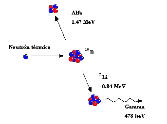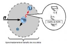 En un 94% se emite un fotón de 478 keV como resultado del decaimiento del 7Li. El rango del 7Li y el 4He (partícula alfa) en el tejido es de aproximadamente 5 m m y 8 m m respectivamente, es decir el diámetro de una célula tumoral (~ 10m m). Por lo tanto, la acción destructiva de la reacción de captura ocurre primariamente en aquellas células cancerosas que han acumulado boro. Las células normales con bajas concentraciones de boro no sufren da?o importante.