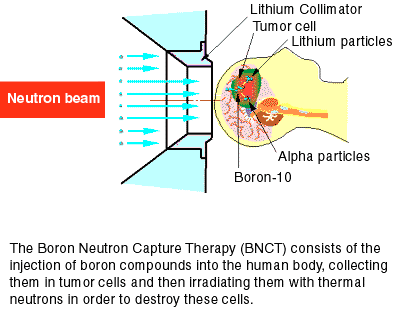 La terapia por captura neutrónica en boro (BNCT) es una técnica binaria que requiere la presencia simultánea de un flujo de neutrones con energía adecuada y un compuesto que contenga un capturador de neutrones (10B), que se acumula preferentemente en las células del tumor. La interacción entre el 10B y los neutrones genera partículas pesadas que atacan a las células del tumor sin producir da?o significativo a los tejidos cuando ambos agentes se encuentran separados.