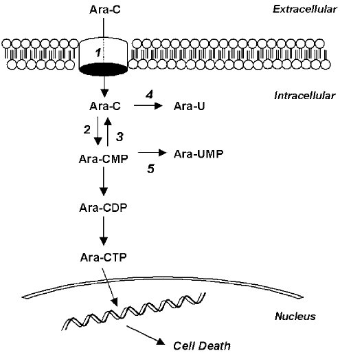 Step 1 above highlights the nucleoside transporter (hENT1) responsible for facilitation of cytarabine entry into the cell. The next step involves phosphorylation to a monophosphate form, Ara-CMP, catalyzed by deoxycytosine kinase (dCK). An additional two phosphorylation steps are catalyzed by (a) (deoxy) cytidylate kinase (UMP-CMPK) and (b) nucleoside diphosphate kinases (NDKs). These two phosphorylation steps result in the formation of araCTP, the active anticancer form. Apoptosis occurs upon araCTP incorporation into DNA during DNA synthesis. Note that araCTP formation can be inhibited by pyrimidine nucleotidase 1 which attenuates the effect of deoxycytidine kinase. Other enzymes can promote conversion of ara-C to other species, an effect that reduces AraCTP concentrations thereby potentially limiting its apoptosis-promoting action. For example, cytidine deaminase and deoxycytidylate deaminase are described as inactivating enzymes since they promote Ara-C conversion to Ara-U in the first instance and Ara-CMP, the monophosphate form, to Ara-UMP (uridine monophosphate) in the second case.3