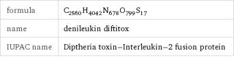 A recombinant DNA-derived cytotoxic protein composed of the amino acid sequences for diphtheria toxin fragments A and B (Met 1-Thr 387)-His followed by the sequences for interleukin-2 (IL-2; Ala 1-Thr 133). It is produced in an E. coli expression system.
