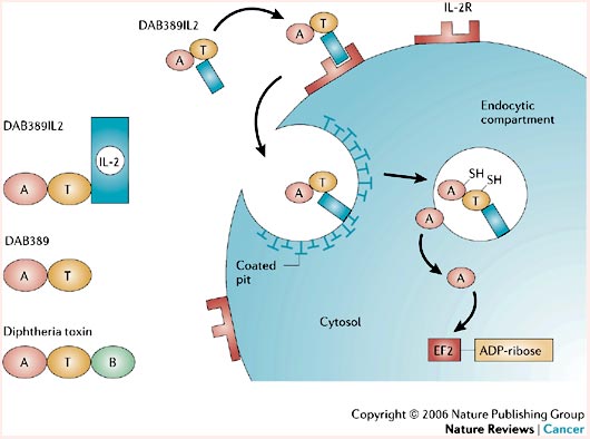 Denileukin diftitox (Ontak) directs the cytocidal action of diphtheria toxin to cells which express the IL-2 receptor. The human IL-2 receptor exists in three forms, low (CD25), intermediate (CD122/CD132) and high (CD25/CD122/CD132) affinity. Malignant cells expressing one or more of the subunits of the IL-2 receptor are found in certain