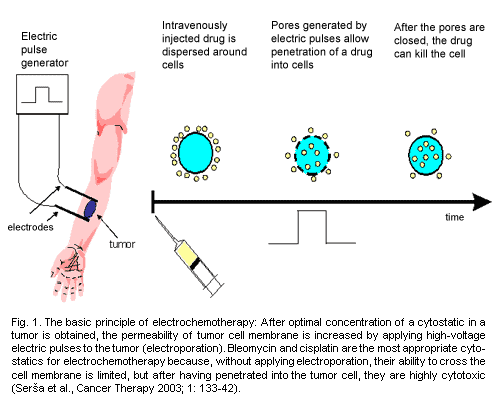 La electroquimioterapia1, 2 es la combinación de impulsos eléctricos muy cortos (100 microsegundos), aunque intensos, y de fármacos anticancerosos que no entran en las células por simple difusión a través de la membrana celular. Los impulsos eléctricos utilizados modifican transitoriamente las propiedades de la membrana celular, resultando en la permeabilización reversible de la célula. De los fármacos anticancerosos habitualmente utilizados para el tratamiento de los pacientes, la bleomicina es el más adaptado a una combinación con los impulsos eléctricos permeabilizantes puesto que el incremento de la toxicidad de la bleomicina puede ser de varios millares de veces3. De esta forma, una dosis habitual de bleomicina (10 a 15 mg/m2 inyectados por via intravenosa) permite obtener resultados antitumorales intensos (desaparición de los nódulos tumorales tratados por los impulsos eléctricos). El cisplatino y las otras sales del platino, también se utilizan con estos impulsos, resultando en un incremento de 5 a 10 veces de la citotoxicidad del cisplatino in vivo. Habitualmente, con electrodos aplicados sobre la piel (no invasivos), se utilizan 8 impulsos de 100 microsegundos y 1300 voltios por centímetro a la frecuencia de repetición de 1 hertzio (es decir, uno por segundo). El voltaje aplicado es pues función de la dis-tancia entre los electrodos, que no suele rebasar el centímetro. El protocolo es tan rápido que si es necesario se hacen varias aplicaciones para cubrir aquellos nódulos cuyo diámetro rebasaría ampliamente el centímetro. Nódulos de hasta 3 centímetros pueden tratarse fácilmente con el material actualmente disponible. Los electrodos pueden ser externos, para impulsos eléctricos transcutáneos, en cuyo caso se aplican el polo positivo y el polo negativo de ambas parte del nódulo tumoral cutáneo o transcutáneo. Los electrodos también pueden ser invasivos, a base de agujas que penetran los tumores.