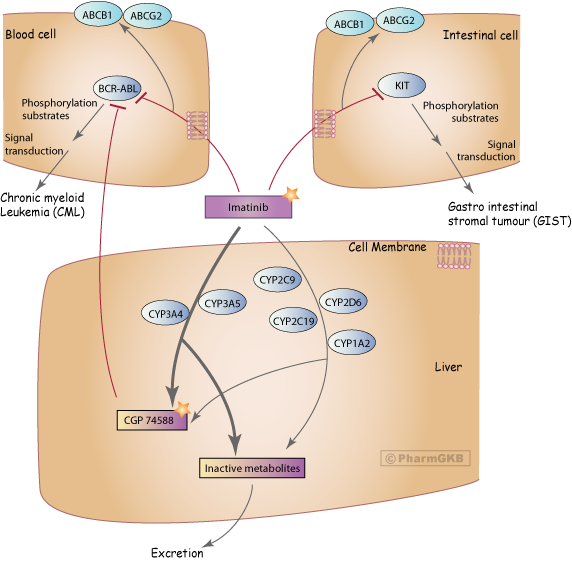 - Metabolismo: El principal metabolito circulante en humanos es el derivado N-desmetilado de piperazina, con potencia similar a la del compuesto inicial. La AUC plasmática para el metabolito fue de sólo el 16% de la AUC del imatinib. El CYP3A4 fue el principal enzima humano del P450 que cataliza la biotransformación de imatinib. De una serie de medicaciones concomitantes (acetaminofeno, aciclovir, alopurinol, anfotericina, citarabina, eritromicina, fluconazol, hidroxiurea, norfloxacino, penicilina V) sólo eritromicina y fluconazol mostraron inhibición del metabolismo de imatinib con posible relevancia clínica. In vitro imatinib mostró ser un inhibidor competitivo de sustratos marcadores para CYP2C9, CYP2D6 y CYPA4/5; no obstante los resultados no registraron una inhibición del metabolismo del paclitaxel, así mismo tampoco se espera una interacción en la administración conjunta de 5-fluorouracilo.