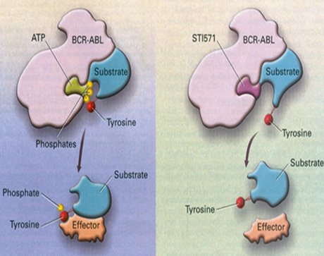 Información: El segundo paso importante fue la introducción de Gleevec® (mesilato de imatinib) “la primera droga del siglo XXI”, para el tratamiento de la leucemia mieloide crónica (LMC). Este tipo de leucemia se caracteriza por una translocación 9;22 que también genera una proteína de fusión anormal. Esta proteína posee actividad tirosina quinasa y por lo tanto está incluida dentro del citoplasma, lo cual provoca que la célula reaccione como si hubiese llegado un impulso al receptor; como consecuencia, esta célula se multiplica en forma continua. El mesilato de imatinib es una molécula que interfiere con los sitios de activación de esta proteína anormal, gracias a lo cual el pronóstico de los pacientes con leucemia mieloide crónica ha mejorado notablemente disminuyendo la necesidad de trasplantes de médula ósea.