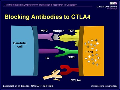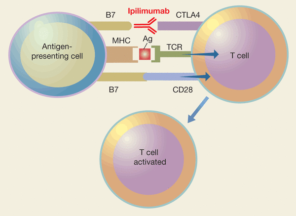Anti-CTLA4 therapy has succeeded where other immunotherapies failed because, instead of trying to indirectly stimulate T cells by presenting tumor antigen to overcome immune tolerance, it activates T cells directly, by disabling a brake on T-cell activity. Normally, when a T cell is activated after CD28 binding of the B7 receptor on antigen-presenting cells, CTLA4 acts as a brake, trafficking from the T-lymphocyte cytosol to the surface to bind B7 molecule with high affinity. Thus CTLA4 turns the T cell off. When the ipilimumab mAb is present it blocks CTLA4, keeping the T lymphocyte activated. The mAb also promotes unfettered binding of the T-cell CD28 receptor to the antigen-presenting cell receptor B7, together with antigen presentation to the T-cell receptor (Fig. 1). Such 'co-stimulation' is necessary for T-cell activation, and antitumor immunity. Unfortunately, ipilimumab also triggers autoimmune side effects, some severe. A few patients have died from colitis-related bowel perforations, for example. But Kirkwood points out, “[for] the vast majority of patients, we can manage the side effects fairly easily, once you know how to look for them.”