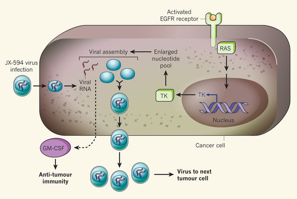 JX-594 es un poxvirus oncolítico diseñado para este proposito. En un ensayo clínico se muestra que JX-594 infecta selectivamente, se replica y actua sobre los productos transgénicos del tejido canceroso después de la infusión intravenosa. Los tejidos sanos no se vieron afectados clínicamente.