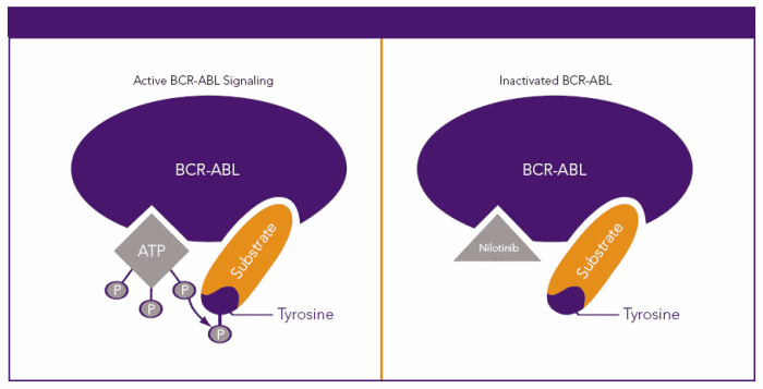 Mecanismo de acción: la translocación entre una parte del cromosoma 9 y una parte del cromosoma 22 ocasiona un gen defectuoso que expresa la oncoproteína Bcr-Abl [así llamada por que el gen que la produce procede de parte gen de región de fractura (BCR, Breakpoint Cluster Region) del cromosoma 22 (situado en la región q11 de este gen) que se fusiona con parte del gen ABL del cromosoma 9 (situado en la región q34)]. La proteína Brc-Abl tiene actividad tirosina kinasa, es decir es capaz de añadir grupos fosfatados a la tirosina, y es capaz de activar una serie de mensajeros que inducen la proliferación celular. El nilotinib se une con alta afinidad al lugar de unión del ATP de tal manera que es un inhibidor potente de la actividad tirosina-kinasa del Bcr-Abl de tipo germinal. Por otra parte, este fármaco mantiene su actividad frente a 32/33 formas mutantes de Bcr-Abl resistentes a imatinib. Como consecuencia de esta actividad bioquímica, nilotinib inhibe de forma selectiva la proliferación e induce la apoptosis en líneas celulares y en células leucémicas primarias cromosoma Filadelfia positivo, de pacientes con LMC.