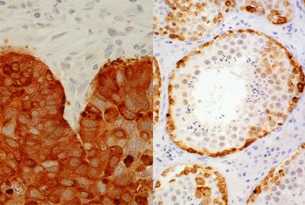 Información: Immunohistochemical staining of cancer-testis antigen NY-ESO-1 in lung carcinoma and in normal testes cells. LICR investigators used an antibody that recognizes NY-ESO-1 to detect cells that express the antigen. The cancerous (brown-color at bottom-left of picture) and normal cells (light grey at top-left of picture) in the lung can clearly be distinguished using immunohistochemistry, which also shows that cells around the periphery of the normal testes cells (right picture) are expressing NY-ESO-1. Because testes cells do not express the major histocompatibility complex, a vaccine targeting NY-ESO-1 will not affect these normal cells.