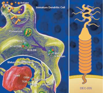 Los DC se originan de progenitores en la médula ósea y migran como células inmaduras a los tejidos periféricos donde ellas internalizan Ag y sufren un proceso de maduración complejo. El Ag se internaliza por vía de un número de receptores de superficie, que incluyen los receptores de complemento (por ejemplo, CDIIc/CD18) y los receptores endocíticos (por ejemplo, DEC-205, DC-SIGN y los receptores similares a Toll). Durante la adquisición Ag, los DC inmaduros también pueden recibir "señales de peligro", en la forma de moléculas relacionadas con patógeno tales como lipopolisacáridos de la pared de células bacterianas (LPS), o estímulos inflamatorios por vía de citoquinas tales como IFN-?. Los DC migran entonces a los órganos linfoides secundarios, madurando para volverse los APC competentes.8 Los receptores tales como el CD11c/CD18, DEC-205, DEC-SIGN y los receptores similares a Toll juegan un papel crucial en el proceso de captura de Ag y la presentación, y se expresan principalmente sobre los DC. Es concebible, por lo tanto, que estos receptores también se puedan utilizar para blanco de Ag directamente al DC in vivo. Consistente con esta noción, las proteínas de fusión compuestas de Ag y anticuerpos de cadena simple (ScFvs) a DEC-205 han mostrado apuntar a los DC in vivo, incluyendo la activación de la célula T cuando se co-administra con estimuladores inflamatorios tales como el anticuerpo anti-CD40.9,10 En contraste, en la ausencia de tales estimuladores inflamatorios, el antígeno blanco a los DC por vía del ScFvs no indujo respuestas a la célula T.