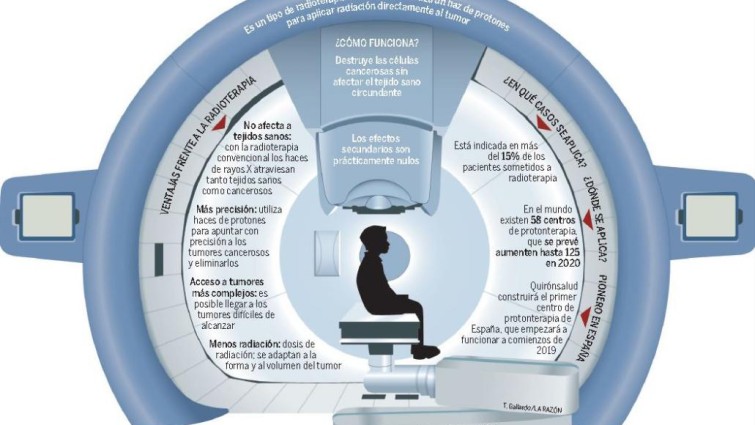 La radioterapia con protones es un tratamiento muy preciso que minimiza el daño en los órganos y estructuras vecinas sanas que rodean el tumor. En el tratamiento de numerosos tumores desplazará a la radioterapia clásica con fotones, por su menor toxicidad y su alta precisión.