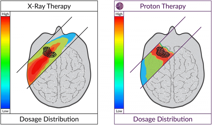 La protonterapia presenta una distribución más eficaz de la energía que los fotones, de manera que posibilidad dirigir dosis más elevadas a la zona del tumor sin incrementar las dosis en otras zonas.