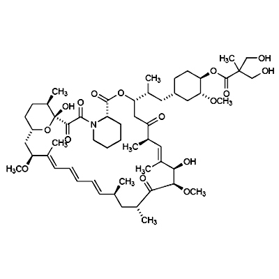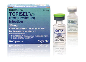 Temsirolimus (Torisel®) es un inhibidor de la vía de la mTOR quinasa aprobado por las autoridades norteamericanas (FDA) en junio de 2007 y por la Unión Europea (EMEA) en noviembre de 2007, indicado en el tratamiento de primera línea de pacientes que presentan carcinoma de células renales avanzado con, como mínimo, tres de seis factores de riesgo pronósticos.