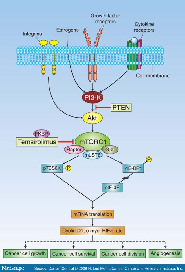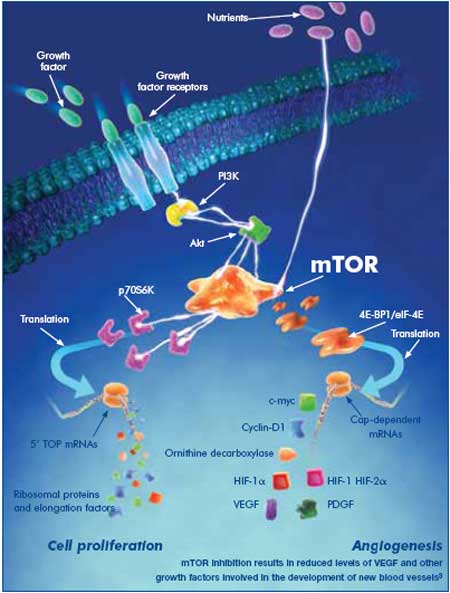 La vía molecular de mTOR ha sido sujeto de múltiples estudios debido a que mutaciones genéticas o aumentos de expresión de varios componentes involucrados en la vía PI3K-AKT-mTOR se han relacionado con la inducción de la transformación maligna celular, la desregulación de la proliferación y la quimioresistencia y también porque uno de los efectos de la activación de mTOR es la inducción de la expresión de VEGF a través de la fosforilación de HIF-1?, que contribuye a la tumorogénesis y neoangiogénesis.