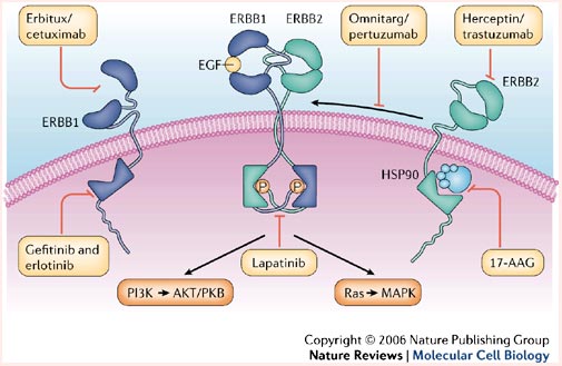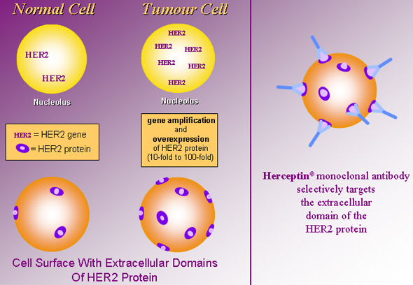 Mecanismo de acción: la sobre expresión de HER2 se observa en el 20-30 % de los cánceres de mama primarios, mostrando los pacientes cuyos tumores sobreexpresan esta proteína una supervivencia libre de enfermedad más corta si se compara con los pacientes cuyos tumores no sobreexpresan HER2. Esta proteína es un receptor de membrana, cuya función no es bien conocida, estructuralmente relacionada con el factor de crecimiento epidérmico