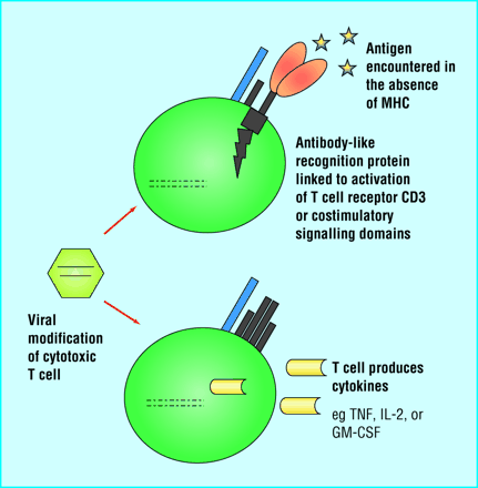 Recently it has become feasible to manipulate the cells most critical in cancer immunity, T cells. Development of techniques of culturing T cells, and development of vectors to introduce appropriate genes, into these cells has led to clinical trials using T cells. A recent review details the progress and future directions for T cell-based cancer immunotherapy.1 (i) In the first strategy, T cells from a different person are infused into the patient. The rationale is that MHC antigen differences, together with the tumor antigens, set up a graft-versus-tumor reaction resulting in T cells from the donor destroying the host's tumor. This is an example of allogeneic lymphocyte therapy10. (ii) A different strategy involves manipulation of CTL cells (see Fig. 7). The rationale here is to bypass the involvement of MHC class I on tumor cells and antigen-presenting cells by directly modifying the cytotoxic T cells to recognize a tumor antigen and become activated. For this purpose a chimeric molecule designed, consisting of an antibody and a T-cell receptor. The antibody recognizes the appropriate tumor and the TCR activates the T cell to combat the tumor. These have been successful in treating ovarian tumors in mice.13