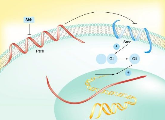 La vía de transducción de señales Hedgehog (Hh) consta de varios componentes: el receptor de membrana Ptch1 ("parchado") y el adaptor - también en la membrana celular - SMO (smothered homologue), así como los efectores Gli que son factores de transcripción. En ausencia de ligando el Ptch1 impide que el SMO libere los Gli. La resultante final es silencio transcripcional. Cuando Shh (sonic hedgehog) se liga al Ptch1 se libera el SMO que a su vez activa los Gli. La resultante final es incremento en la transcripción, con proliferación celular (ver figura). La vía Hh es importante durante la embriogénesis.