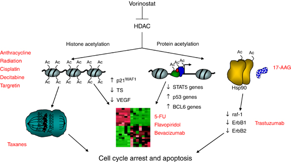 Proposed mechanisms of action of vorinostat in inducing tumor cell cycle arrest and apoptosis.