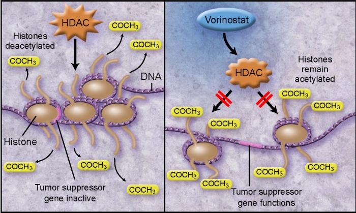 Información: Figure 1 Mechanism of action of vorinostat. The tight coiling of DNA that results from the deacetylation of histones inhibits the transcription of important tumor suppressor genes (left). With histone deacetylases (HDACs) inhibited, acetylated histones cause DNA relaxation, allowing tumor suppressor genes to be accessible for transcription (right). Illustrated by Taina Litwak, CMI.